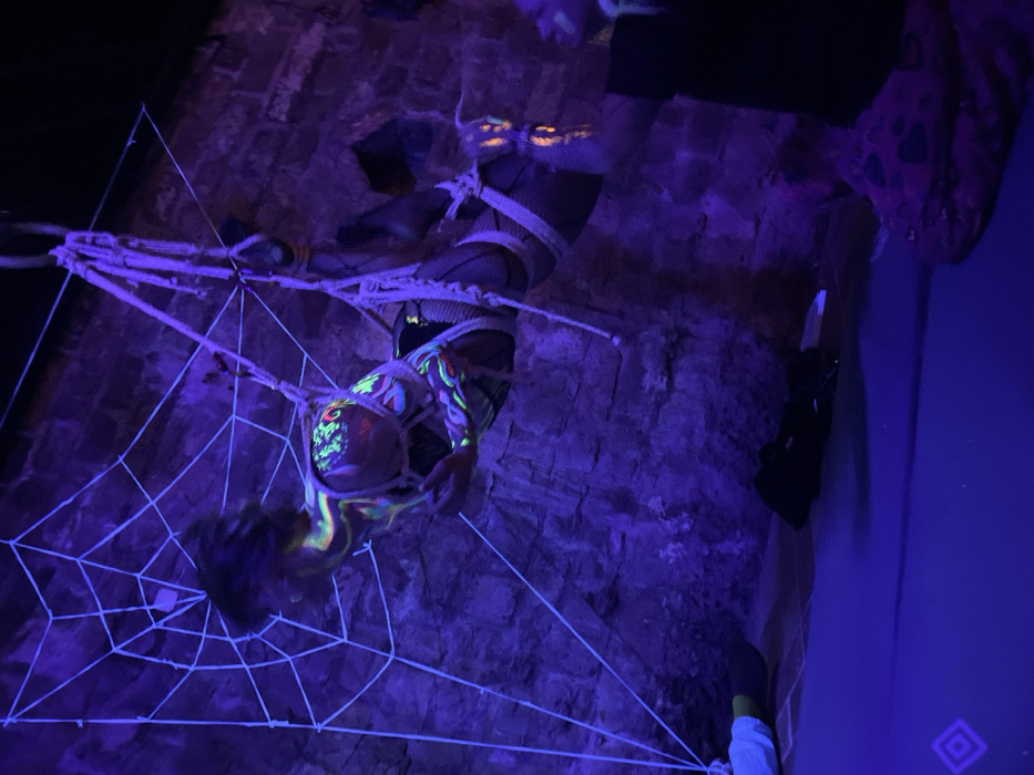 A person is suspended in a web of rope under blacklight. Their body is wrapped with rope, and their face and upper body appear to be painted with fluorescent patterns. The scene is indoors, possibly a dungeon-like space with rough stone walls in the background. A black object, possibly a speaker or bag, is mounted on the wall. The overall mood is dark and mysterious.
