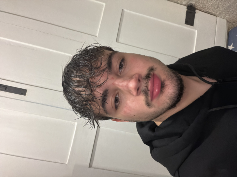 A close-up selfie shows a young man with wet, dark hair and a neatly trimmed beard. He gazes directly at the camera with a slight smile. The man is wearing a black hoodie. The background features a white paneled door with dark hardware, suggesting an indoor setting. The lighting casts soft shadows, highlighting his facial features.