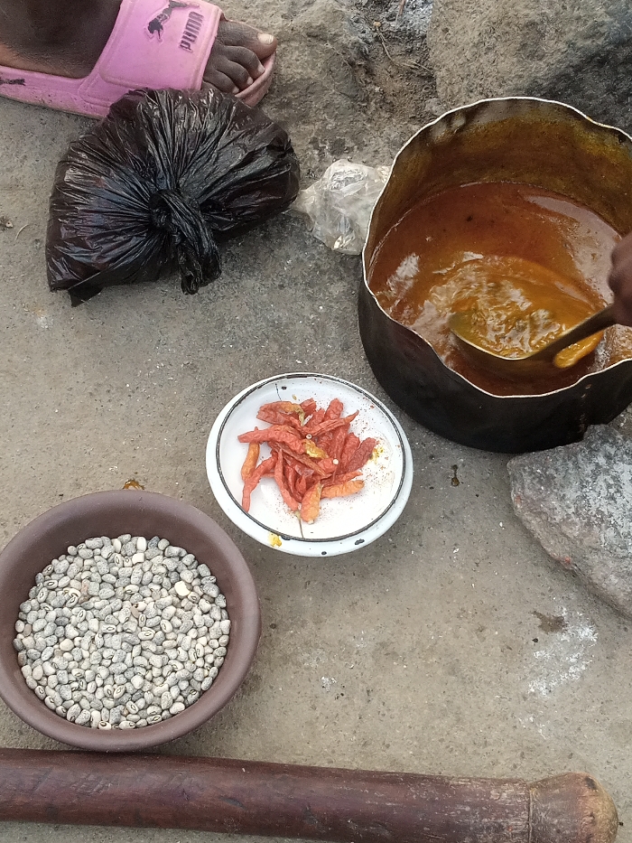 A top-down shot shows food preparation on a concrete surface. A black pot filled with a yellow-orange liquid is being stirred with a spoon. Next to it is a plate of red chili peppers. A brown bowl filled with beans and a wooden pestle sit below. A black plastic bag, a piece of clear plastic, and a pink sandal are also visible.