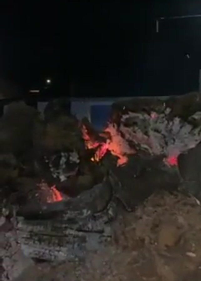 small bonfire burning at night. The embers glow orange and red. The camera then pans to show a church decorated with white lights and a blue star. There are streetlights nearby and houses across the street.