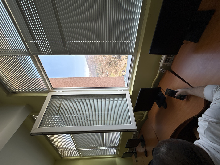 An interior shot depicts a computer lab or classroom in Belogradchik, Bulgaria, characterized by light green lower walls and white upper walls. Multiple horizontal windows with white frames line the wall, fitted with closed horizontal blinds. One central window is open, tilting inward from the top, providing a view of the outdoors. Through the open window, a clear blue sky is visible above a reddish-brown building facade. Below, a dark gray flat roof transitions to an outdoor ground level featuring sparse, bare trees and brown vegetation, indicative of a colder season. In the distant background, a mountain range with some tree cover is present. Two small, indistinct figures are visible on the ground level outside. Inside the room, curved wooden desks are arranged along the windowed wall. At least four black computer monitors with dark screens are positioned on these desks. White heating radiators and associated piping run along the wall beneath the windows. In the immediate foreground, from an over-the-shoulder perspective, a person wearing a white short-sleeved shirt is seated at a desk. This individual holds a black smartphone in their right hand, appearing to be actively viewing its screen.