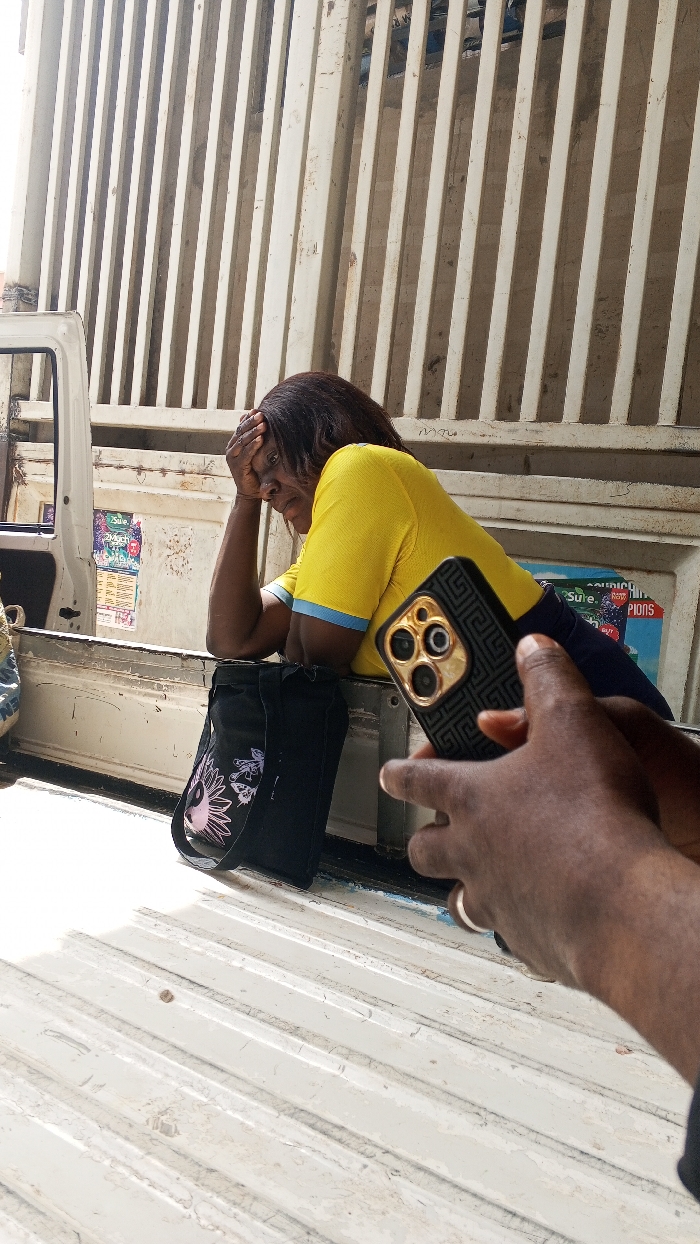 The scene, located in Fagge C, Nigeria, depicts the interior of a vehicle's cargo area. A dark-skinned woman with dark, shoulder-length hair, wearing a yellow short-sleeved shirt with light blue trim and dark lower garments, is positioned on the right. She leans forward, resting her right elbow on a low, light-colored panel, with her right hand partially covering her forehead, and her gaze directed downwards. Adjacent to her, on the panel, is a black canvas tote bag featuring a white and pink sun-like design and white butterfly motifs. In the immediate foreground, dark-skinned hands hold a black smartphone, featuring a gold multi-lens camera array and a textured case, positioned as if capturing or presenting the woman. The floor of the vehicle is a ribbed, off-white metal surface exhibiting signs of wear and chipped paint. The background consists of white paneled walls, one displaying remnants of faded posters, and further back, a prominent, vertically ribbed, light-colored metal wall extending upwards.