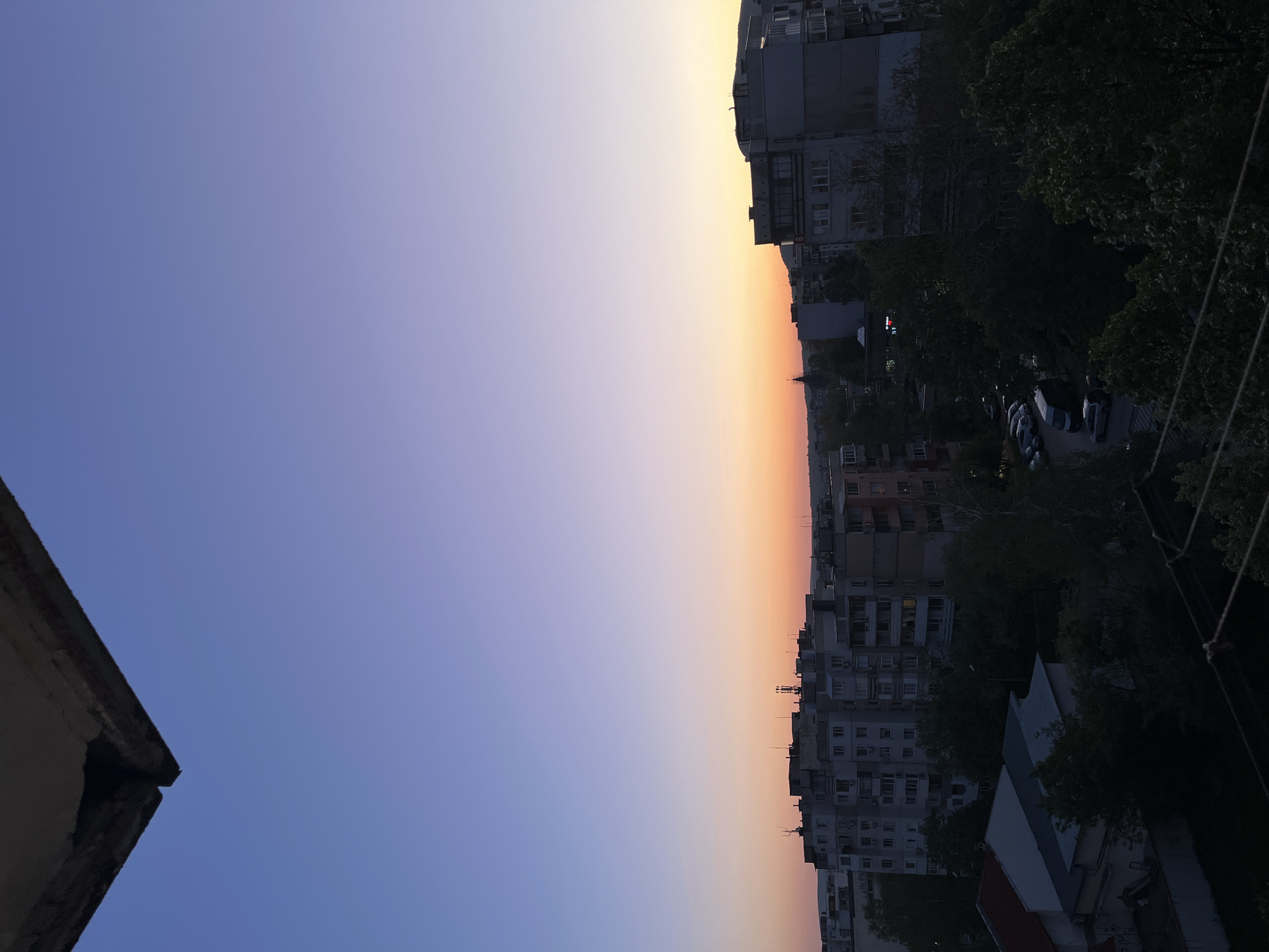 The image depicts a cityscape at dusk or dawn, likely in Vratsa, Bulgaria, based on the architecture. The sky transitions from a light blue to an orange-yellow horizon. Buildings, predominantly apartment blocks of Soviet-era design, line the right side of the image. Trees and parked cars are visible in front of the buildings. A corner of a building is visible in the lower left corner of the frame. Power lines are seen crossing the right side of the frame.