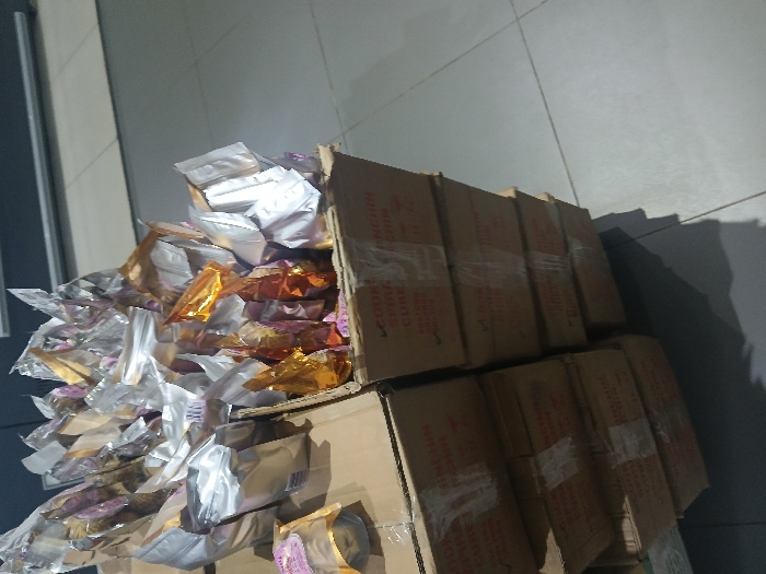 This image captures an indoor scene in Barden Yana, Nigeria, featuring stacks of cardboard boxes containing commercially packaged goods