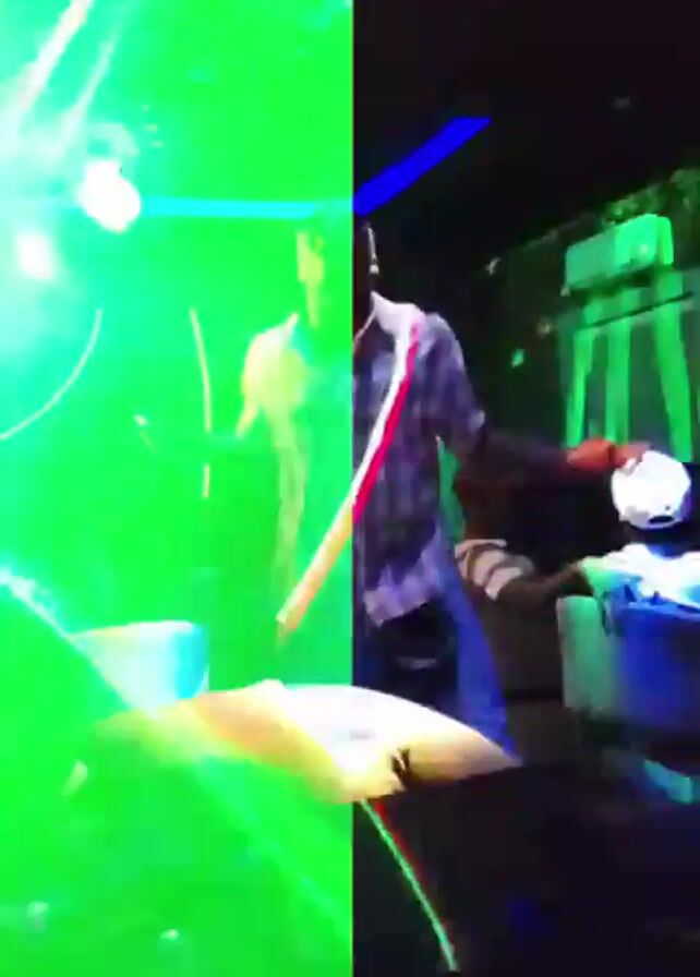 person dancing in a dimly lit room with colorful lights. The person is wearing a plaid shirt and jeans. They are moving their arms and body to music. Other people are sitting in the background. The room has a dark ceiling with blue lighting accents and a decorative light fixture. The floor is dark and reflective. Other lighting includes vertical bars of alternating green and red lights.