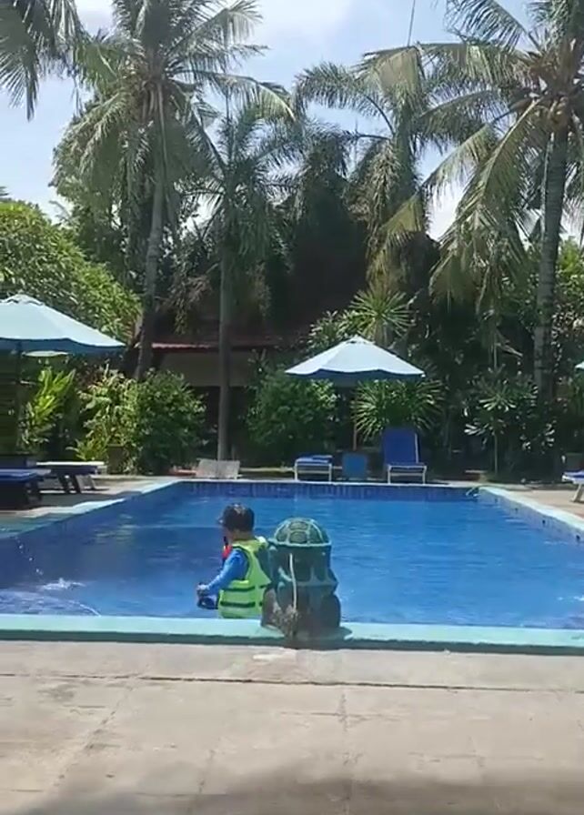 Here is a brief description of the video. The video shows a child in a life jacket swimming in a pool. The pool is surrounded by palm trees and lounge chairs with umbrellas. A turtle statue sits at the edge of the pool, next to the child. The sky is blue with some clouds.