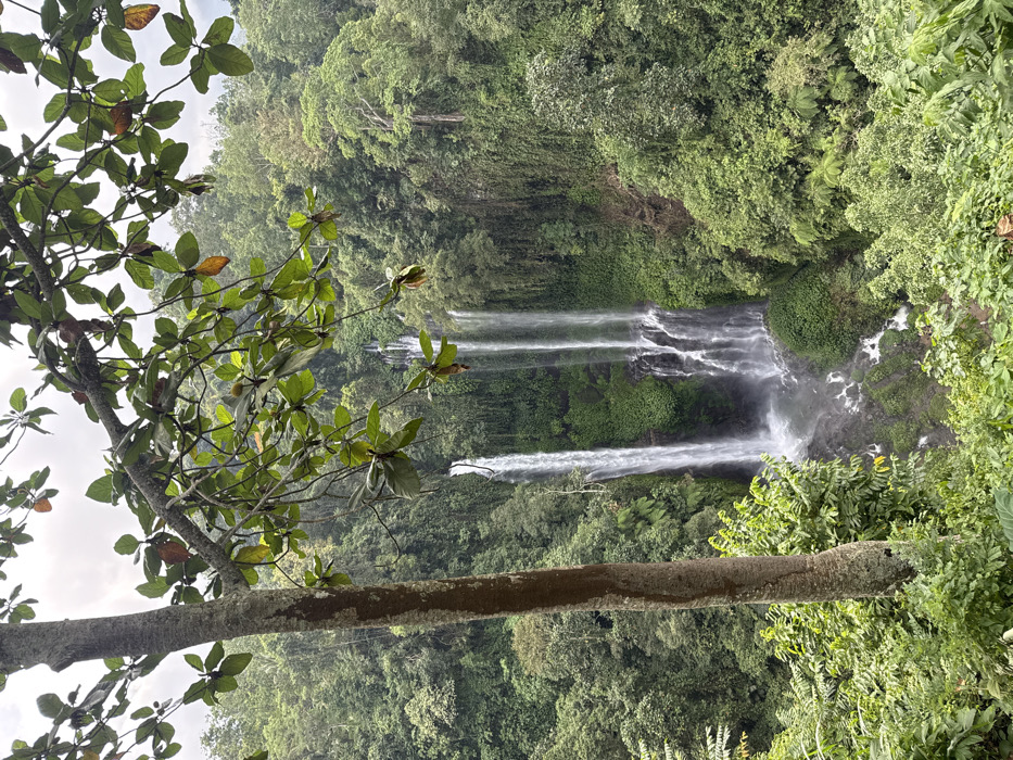 A lush forest surrounds a waterfall cascading down a rock face. Multiple streams of water plunge into the pool below. The greenery is dense and vibrant. In the foreground, a tree with green leaves partially obscures the view. A tree trunk stretches across the lower portion of the frame. The sky is overcast, contributing to a slightly muted color palette.