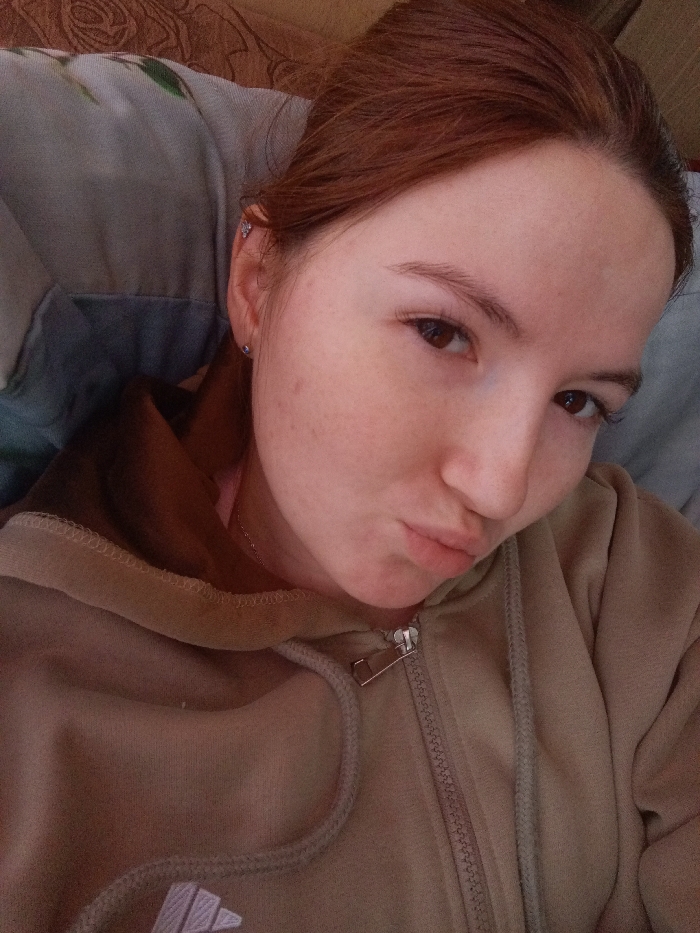 A close-up portrait, likely a selfie, depicts a single light-skinned individual, identified as a young adult female, positioned indoors. She has reddish-brown hair, brown eyes, and naturally shaped light brown eyebrows. Her facial expression shows slightly pursed lips, directed towards the camera. The individual wears a small stud earring in her left earlobe and a small helix piercing in the upper cartilage of her left ear. She is dressed in a light brown/tan zippered hooded sweatshirt, with a faint light-colored Adidas logo visible on the left side of the chest area. A thin silver-colored chain necklace is visible around her neck, and a pink garment is worn underneath the sweatshirt. The background behind her consists of a blurred, light blue-grey patterned fabric, suggestive of a pillow or upholstered surface. There are no discernible visual elements within the image to confirm the location as Старый Шагирт, Russia.