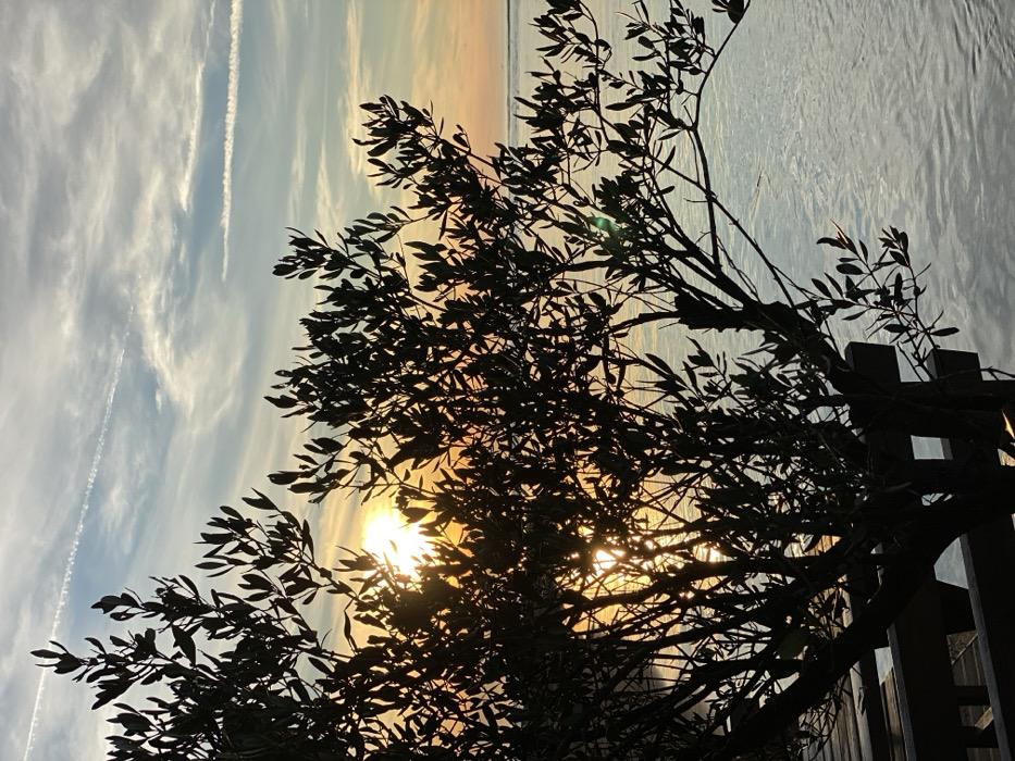 A silhouette of a tree with leaves fills the frame, obscuring the sun. Sunlight streams through the branches, creating a bright glow. The sky is divided into sections of blue, orange, and white, with wispy clouds. A fence partially visible on the right side of the shot. The water reflects the sky's colors, adding another layer of visual texture to the background.