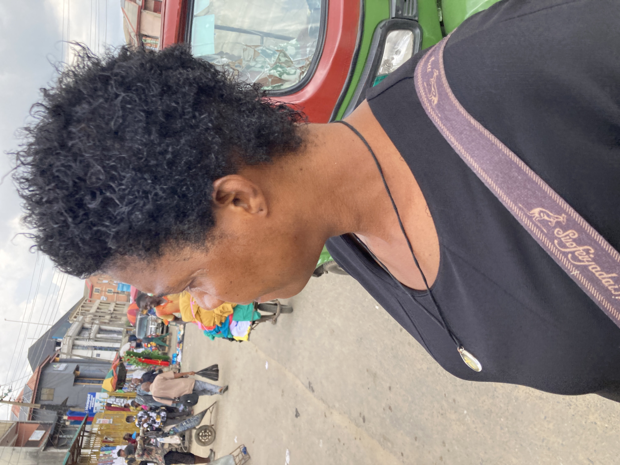 The image presents a street scene in Ura Nta Umuarandu, Nigeria, characterized by active market commerce. The foreground features the right profile of an individual with dark skin and short, kinky black hair, oriented away from the camera. This person wears a black top, a thin black cord necklace with a small, reflective teardrop-shaped pendant, and a purple woven strap with a lighter pattern, possibly from a bag, diagonally across their left shoulder. The midground and background depict a busy urban thoroughfare under an overcast sky. A concrete road, with scattered debris, is populated by numerous pedestrians. Visible individuals include a person in a light brown shirt and grey trousers walking away from the camera, carrying a black bag, and another in an orange shirt partially obscured. Market stalls line the street, displaying various goods such as clothing on mannequins and racks. A handcart loaded with brightly colored fabrics is present in the midground. A green and red motorized rickshaw with a visibly cracked windshield is positioned on the right side. Multi-story buildings, some with dark facades and solar panels on rooftops, form the backdrop. A white sign with blue text "Moringpoint" is visible on one of the buildings.