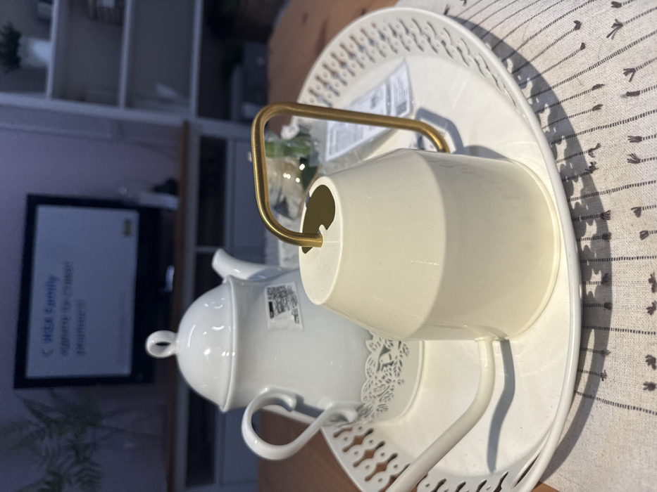 The image depicts an indoor retail showroom environment, identifiable as an IKEA store by branding visible on a television screen. City: Unknown, State/Country: Unknown. In the foreground, a white, oval-shaped metal tray with a decorative, perforated edge is centered on a light-colored textile mat with a striped pattern and small, dark abstract motifs. Positioned on the tray are two primary objects: 1. A white ceramic teapot with a lid, featuring a delicate, lace-like cutout pattern around its base. A product sticker is visible on its side. 2. A cream-colored, metal watering can with a slender, curved spout extending to the left and a gold-colored, U-shaped handle. In the background, a light-toned wooden media console or cabinet supports a flat-screen television. The television screen displays text, including "IKEA family" and partially visible Swedish text ("VÄLKOMMEN TILL"). To the left of the console, a plant in a clear vase is partially visible. To the right, a white shelving unit with multiple shelves holds a small potted plant and other indistinct items. The walls are a light, muted color. No individuals are present, and no actions or interactions are depicted. The scene is a static display of merchandise under ambient indoor lighting.