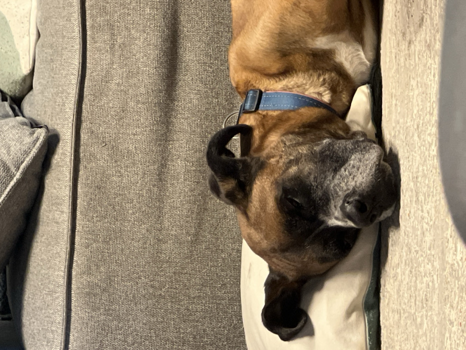 The image presents an indoor scene located in Kadima, Israel. A single, recumbent Boxer dog is depicted, resting on its right side with its eyes closed, indicating a state of sleep or deep rest. The dog exhibits a brown brindle coat with white markings on its chest and a distinctively graying muzzle, suggesting an older age. A blue fabric collar with a black buckle is secured around its neck. The dog's head is positioned on a small, off-white rectangular pillow featuring a dark green or teal border. The animal lies on a light-colored, textured floor covering, consistent with carpet. In the background, a section of a gray, woven fabric sofa is visible, partially obscured by a gray throw pillow. A light-colored, curved object is partially visible in the lower right foreground. No human subjects are present in the frame.