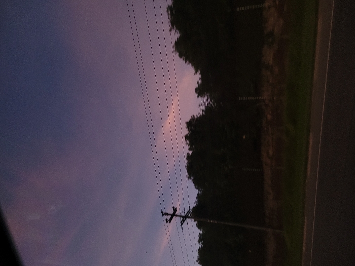 A vertical shot shows a dark scene with utility poles and wires bisecting a dusky purple sky. The wires run diagonally across the frame, from upper left to lower right. To the right, a dark treeline meets the edge of a road, creating a stark contrast with the sky. The road is a dark gray and blends into the shadows. The sky has hints of pink and orange, suggesting either sunset or sunrise. The overall mood is quiet and somber.