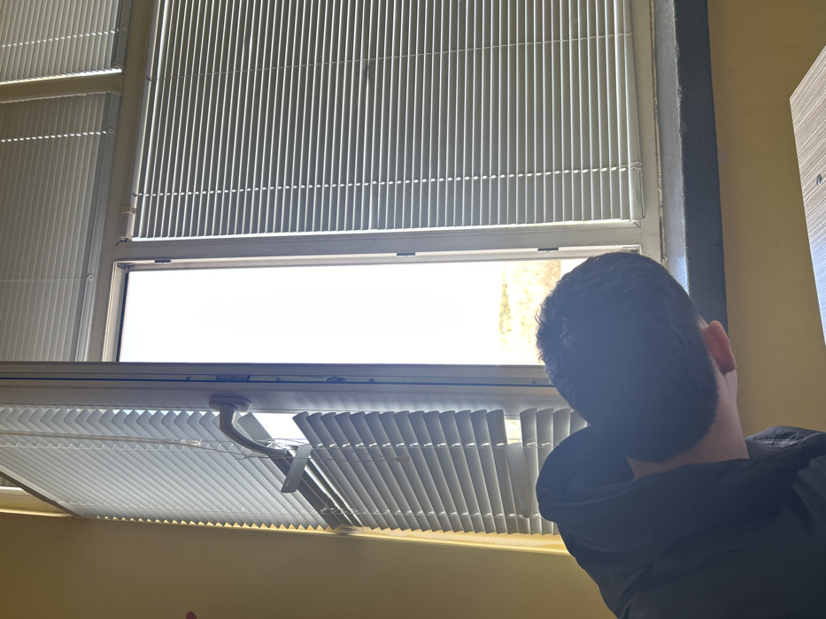 The scene depicts an interior setting, identified as a room in Varna, Bulgaria. A large window with white frames and horizontal venetian blinds occupies the right side of the image. The leftmost pane of the window is partially open inward, revealing a bright, overexposed outdoor landscape with what appears to be sunlit, dry terrain or vegetation. The venetian blinds on this open pane are partially dislodged and bent near the window handle. The blinds on the adjacent window panes are closed. A dark, possibly stone or concrete windowsill runs across the bottom of the window frame. The interior features a yellow wall to the left and a light-colored wooden surface, likely a desk or table, in the lower foreground. The back of a person's head, with short dark hair, and shoulders encased in a dark hooded garment, are visible in the lower left quadrant, positioned with their gaze directed towards the window or a surface immediately in front of it.