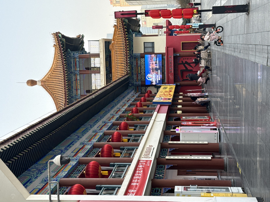 The image depicts a commercial street scene in Yuzhong District, China, characterized by traditional Chinese architecture under a clear, bright sky. The prominent structure on the left is a multi-story building featuring an extended covered walkway adorned with numerous red Chinese lanterns, each with a yellow tassel, hanging from an ornate overhanging roof. This roof is supported by dark red pillars and features intricate blue, green, and gold decorative patterns along its eaves. A white dome-shaped surveillance camera is mounted on a pole extending from the building's facade. The lower level of this building includes storefronts and several brightly illuminated commercial vending or entertainment machines, such as claw machines, positioned along the reflective dark grey tiled pavement. A long red banner with Chinese text is affixed to the building's upper facade. To the right and slightly behind the first structure stands a multi-tiered pagoda-style building, also featuring traditional orange-brown roof tiles and ornate detailing. An open-air balcony with a metal railing is visible on an upper level. A large LED screen is affixed to its facade, displaying colorful imagery, likely an advertisement or scenic video. Below the screen, the building is painted red with traditional Chinese characters. In front of this red building, an outdoor seating area is arranged with several small tables and chairs. Multiple individuals are present: approximately five adults are seated, engaged in conversation or using mobile phones. One adult is seen squatting or kneeling near the seated group. On the right side of the frame, a lighter grey tiled sidewalk features a small child, dressed in light clothing, actively riding a pink and black balance bike or tricycle. Further along this sidewalk, a series of dark poles are vertically adorned with stacks of red Chinese lanterns. In the distant background, modern high-rise buildings are visible, indicating an urban environment.