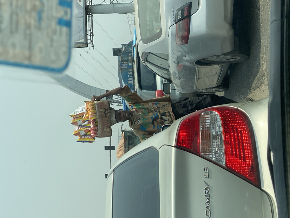 A male street vendor stands amidst congested vehicle traffic in Jakande, Nigeria, under a hazy daylight sky