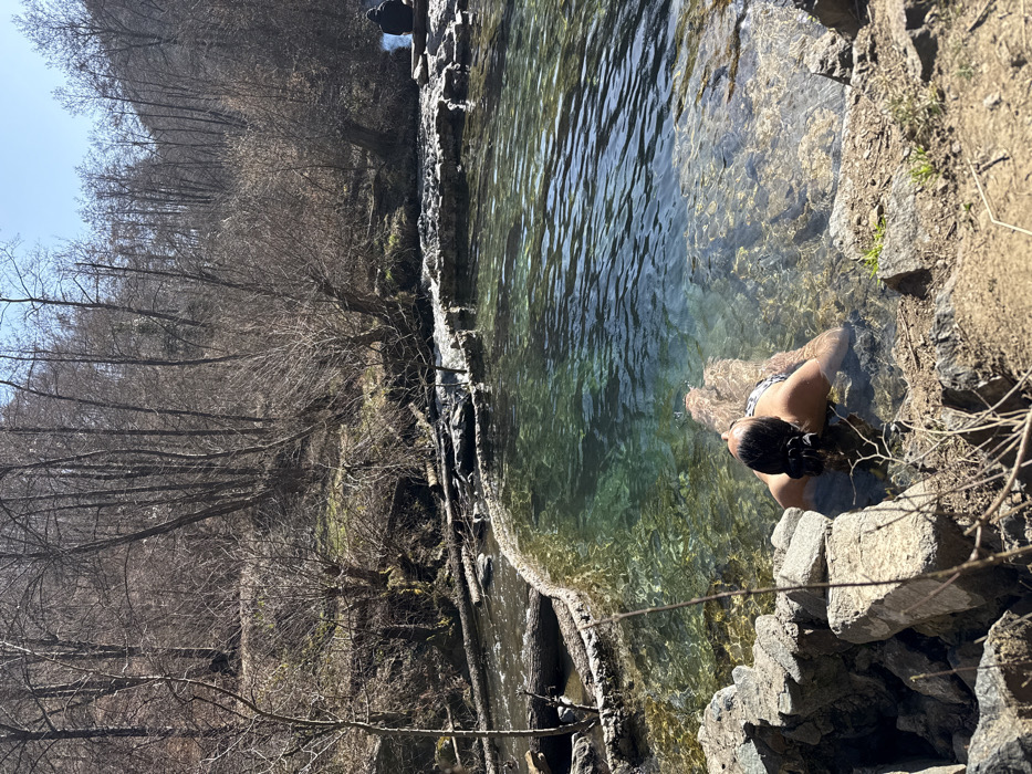 A natural outdoor scene in Zheleznitsa, Bulgaria, is depicted on a clear, sunny day. In the immediate foreground, an adult individual is partially submerged in a clear, turquoise-green natural pool, facing away from the camera. The individual's dark hair is tied in a bun, and they are wearing a patterned top. The transparent water allows visibility of the pool's bottom. The pool is bordered by natural rock formations on the near side and a barrier of rocks and submerged logs that separates it from a flowing river. Several additional logs are present within the river. On the far bank of the river, a second individual is seated, presented as a dark silhouette, positioned next to a small fire emitting white smoke. The background consists of a dense forest of bare deciduous trees extending up a hillside.