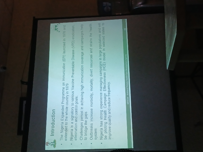 The image displays an indoor scene in Makurdi, Nigeria, centered on a large projection screen exhibiting a presentation slide. The slide is titled "Introduction" and outlines points related to public health in Nigeria. Visible text includes details about the Nigeria Expanded Programme on Immunization (EPI), launched in 1976 and expanded in 1979; Nigeria's role as a signatory to Vaccine Preventable Disease (VPD) eradication goals; persistent challenges in immunization coverage; the impact of outbreaks on the health system; and the piloting of a Health Campaign Effectiveness (HCE) model by Nigeria. The bottom of the slide features the text "NPHCDA - National Primary Health Care Development Agency" and the slide number "39." The room appears dimly lit, with the projection screen being the primary light source. A small, dark security camera is mounted on the ceiling above the screen. In the foreground, on the right side of the image, a section of a light-colored wooden table is visible. No individuals are present in the frame.