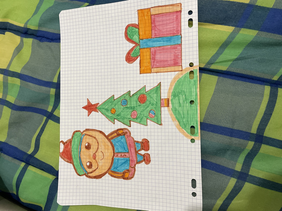A drawing on graph paper features Christmas-themed images: a present with a blue ribbon, a Christmas tree adorned with a red star and colorful ornaments, and a smiling elf wearing a red hat and blue outfit. A green half-circle sits beside the tree. The drawing is slightly crooked on a bedspread with a green, blue, and yellow plaid pattern.