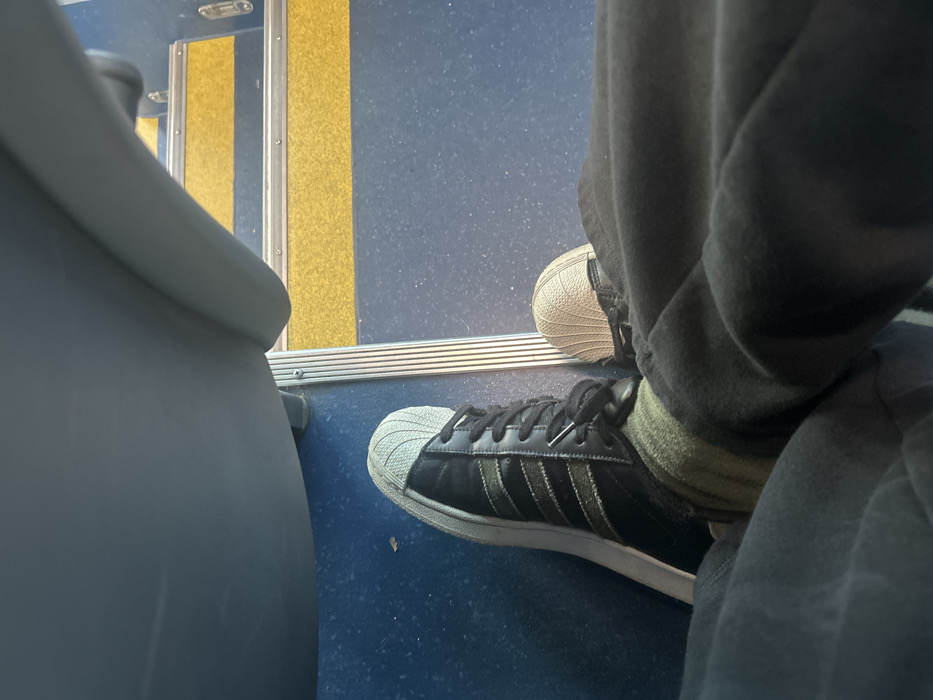 - "A downward-angle, first-person perspective photograph depicts the lower extremities of an individual seated within a public transport vehicle or station in Ostwald, France" by FM-joMVs2, licensed under CC BY 4.0