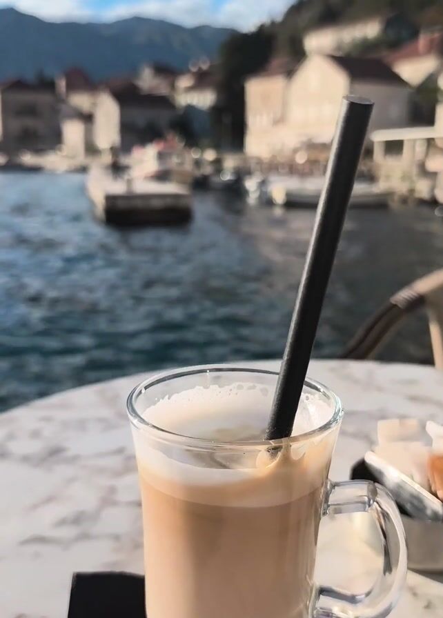latte with a black straw on a marble table, with a scenic backdrop of a bay in Perast, Montenegro