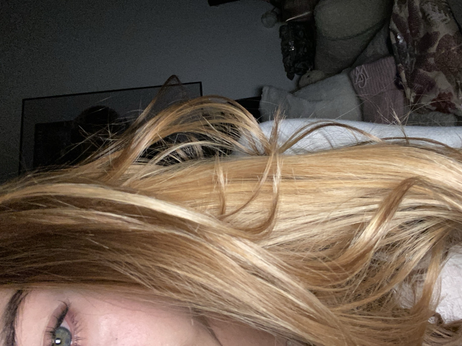 A close-up shows long, blonde hair with some lighter highlights scattered across the surface