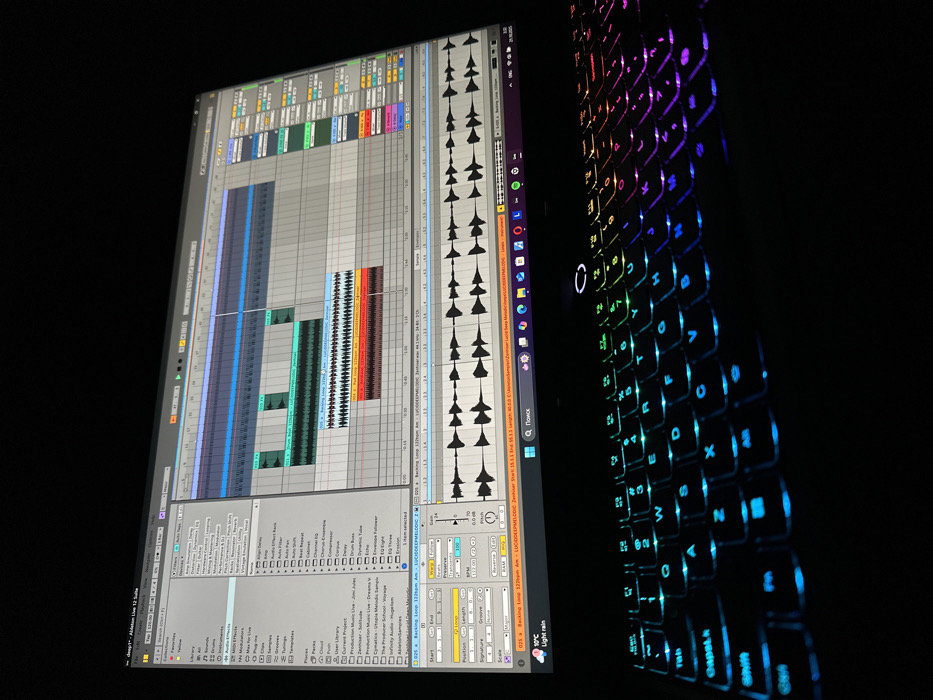 The image depicts a close-up, angled view of an active laptop in a dark environment, presumably in the city of Tairov, Armenia. The laptop screen displays the Ableton Live 12 Suite digital audio workstation (DAW) software, showing multiple tracks with audio waveforms and MIDI clips, indicative of music production activity. The left side of the screen shows the software's browser, while the main window features an arrangement view with several colored tracks, including one highlighted as "025 a. Backing Loop 122bpm Am - LUCIDDEEPMELODIC". The Windows 11 taskbar is visible at the bottom of the screen, displaying a search icon, a weather icon showing "10°C Light rain", a browser icon, and a Spotify icon, along with the date "29.10.2023". Below the screen, the laptop's keyboard is prominently featured, illuminated by a multi-color RGB backlight that transitions from cyan and blue on the left to green, yellow, orange, and purple hues on the right. No individuals or direct human actions are visible, but the active screen and illuminated keyboard suggest recent or ongoing use. The surrounding area is uniformly dark, indicating a low-light setting.