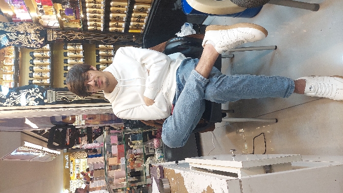 A young man with glasses and a white hoodie sits with legs crossed in what appears to be a store