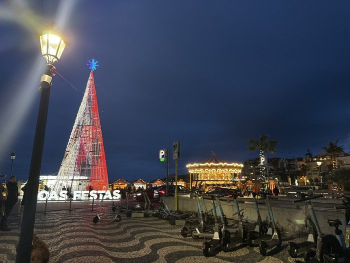 This image depicts an outdoor festive scene at night in Cascais, Portugal, likely near the Cidadela or Cascais Bay area. In the foreground, a black street lamp with an active yellow light fixture stands prominently on the left. The ground consists of dark-toned cobblestones arranged in a wavy, mosaic-like pattern. To the right of the street lamp, a large, conical Christmas tree structure, illuminated with alternating red and white lights, dominates the central mid-ground. A blue, star-shaped ornament tops the tree. In front of the tree, large white illuminated letters spell "BOAS FESTAS." To the right of the foreground, a row of approximately ten parked electric scooters, primarily blue and black, are visible. Beyond these scooters, a low, light-colored concrete barrier separates the promenade from a roadway where several vehicles are present. Further into the mid-ground, a brightly lit traditional carousel with a golden and red canopy is visible on the right. The background features a series of small, illuminated wooden stalls, indicating a market setting. Numerous indistinct human figures are scattered throughout the market area and near the Christmas tree. Further back, on a gentle incline, multi-story buildings and houses with illuminated windows line the landscape. Several palm trees, some adorned with lights, are interspersed among the structures, particularly on the right side. A small, brown-colored animal, possibly a dog, is partially visible at the bottom left, near the street lamp. The sky is a deep, dark blue, characteristic of twilight or nighttime. Several blue parking signs with a white 'P' are visible within the scene.