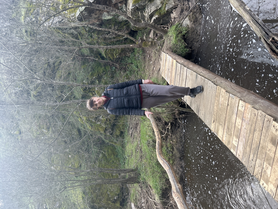 An adult female stands centrally on a rustic wooden footbridge spanning a dark stream in a natural, wooded environment within Harmanli, Bulgaria