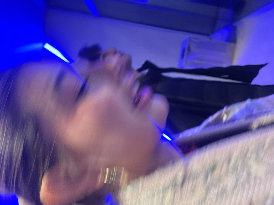 A blurry, close-up captures two people under blue lighting. The foreground shows a person with short dark hair and a gold earring, their face distorted by motion. Behind them, another individual is visible. A black object with white trim sits in the background, possibly a television. The image is blurry, suggesting movement during capture.