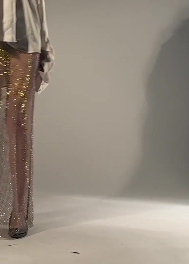 A model stands on a white seamless paper backdrop in what appears to be a photography studio. The model is wearing a long, semi-transparent, mesh-like skirt covered with glittering accents and an oversized, off-the-shoulder white shirt. The skirt appears to have slits up the sides. The camera focuses on the model's legs and lower body, highlighting the details of the skirt and its texture. In the background, there is a lighting setup with a softbox, stands, and other equipment, as well as a stack of chairs. The scene is brightly lit, emphasizing the sparkle of the skirt and the white background.