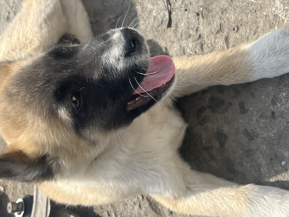 A tan-furred canid, likely a puppy, with a distinctive black facial mask covering its muzzle and extending to its ears, is depicted lying prone on a coarse, gray concrete surface. The animal's chest and paws exhibit lighter, off-white fur. Its mouth is open, revealing a pink tongue extended in a panting posture, with white whiskers visible around the muzzle. The eyes are dark brown. In the blurred upper-left background, metallic or mechanical components are partially visible. This scene is observed in Laka, Bulgaria.