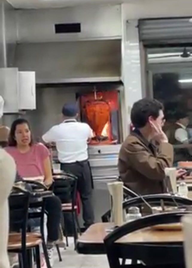 interior of a restaurant with patrons seated at tables. In the background is a rotisserie with a large piece of meat cooking over flames. A man wearing a white shirt and dark pants stands at the rotisserie, presumably tending to the meat. A waiter in a black vest and white shirt delivers food to a table. Two customers sit at a table in the foreground; one is a woman in a pink shirt and the other is a man in a brown jacket. The man is holding his hand to his head. The restaurant has white walls, tile flooring, and fluorescent lighting.
