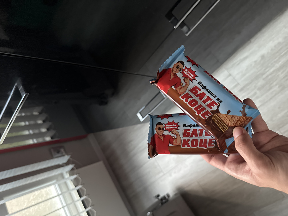 The image displays an interior environment. A human hand, positioned in the lower-left, grasps two identical, commercially packaged wafer bars. Each bar wrapper is light blue and brown, emblazoned with an illustration of a man in sunglasses and a red shirt, exhibiting muscular arms. Cyrillic text prominently displays "БАТЕ КОЦЕ." Additional Cyrillic text visible on the wrappers includes "Вафла" (Wafer) and "Всички обичат" (Everyone loves). The visible face of the front wafer bar's wrapper shows a depiction of a chocolate-layered wafer. The background to the left features a window fitted with white vertical blinds, above a white wall that includes an electrical outlet and a white radiator. The floor surface is light-colored, possibly laminate or tile. The right side of the image is dominated by a dark, highly reflective panel, possessing a horizontal metallic handle. This panel reflects elements of the room. No visual identifiers for a specific location within Haskovo, Bulgaria, are present in the image.