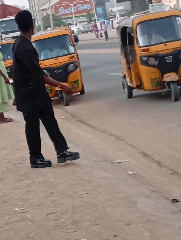 A man dressed in black stands on a dirt road between two yellow auto rickshaws. One auto rickshaw is closer, facing the camera and revealing its license plate. Behind it, the other faces the left. In the background, indistinct figures walk near buildings, including one bearing an “Indomie” sign. The lighting suggests early morning or late afternoon.