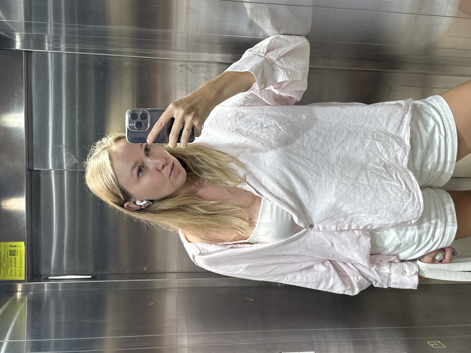 A woman takes a selfie in a modern elevator. She wears white shorts, a white top, and a slightly unbuttoned striped pink and white shirt. She holds her phone in her left hand, displaying the back camera. She has blonde hair, fair skin, and is wearing an earpiece in her left ear. The elevator interior is metal with vertical lines and a yellow sticker on the side.