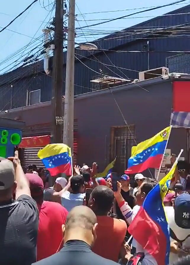A group of people are gathered in a street, waving Venezuelan flags. They are standing near a building with a sign that reads "COMERCIALIZADORA MR QUESOS". A large speaker system is also present, playing music. The people appear to be celebrating or protesting. The sky is blue and the weather is sunny. A lot of power lines overhead the crowd.