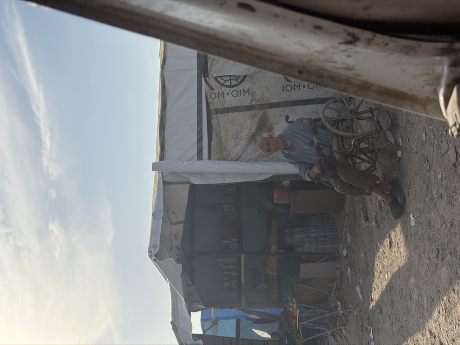 An elderly man is seated in a manual wheelchair on unpaved, dusty ground, looking directly towards the camera. He wears a light-colored long-sleeved shirt and dark trousers, and holds a dark fabric item in his lap. Behind him, a makeshift market stall or shelter constructed from white tarpaulins features shelves displaying bottles, cans, and stacked water bottles. A section of the shelter's wall exhibits repetitive "IOM" and "OIM" text with a circular logo. To the left, another stall with a blue tarp covering displays fresh produce on a small table. The scene is illuminated by daylight under a clear, light blue sky with minimal cloud cover, casting shadows on the ground. A partial view of a dirty, off-white vehicle door frame is visible in the right foreground, suggesting the image was captured from inside a vehicle. This scene is located in Gaza, Unknown.