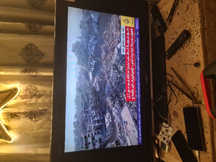 The image depicts an indoor scene, identified as being in Barza Municipality, Syria. A black Sony Bravia flat-screen television is centered in the frame, displaying an aerial news report from Al Jazeera. The report shows a wide view of an urban area with extensive destruction, featuring numerous collapsed and severely damaged multi-story buildings, consistent with a war zone. Overlaid Arabic text on the screen indicates "Gaza.. Ceasefire" (top right) and a red banner stating "Aerial photos show massive destruction in Al-Hawa neighborhood in Gaza City due to the Israeli war on the Strip." A lower banner mentions "Macron will discuss during his visit to Egypt the next steps regarding extending the peace plan in Gaza," along with a timestamp of 03:15. Below the television, a cluttered, light-colored wooden or laminate surface holds various objects. These include two dark-colored smartphones, a white electronic device displaying "16:00," a blister pack of pills, eyeglasses, multiple television remote controls (one black, one partially visible), and a small red and black hand tool. Scattered small items such as wires, screws, small metallic tools (tweezers, a pick), and debris are also present on the surface. In the background, above the television, light-colored (beige/gold) curtains with a repetitive dark damask pattern are visible. A yellow, star-shaped light decoration illuminates the top center of the curtains. No people are visible in the scene.