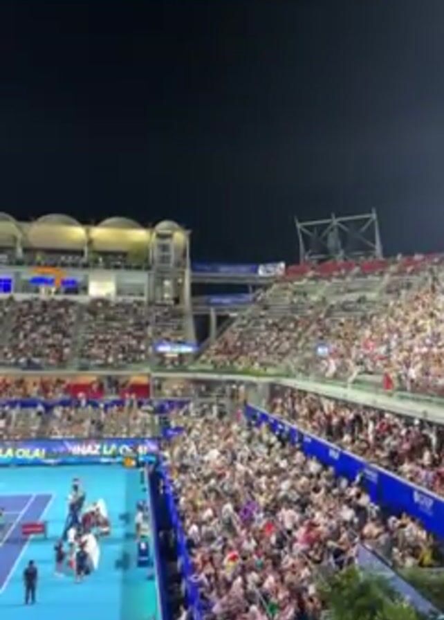 The video captures a bustling tennis stadium at night