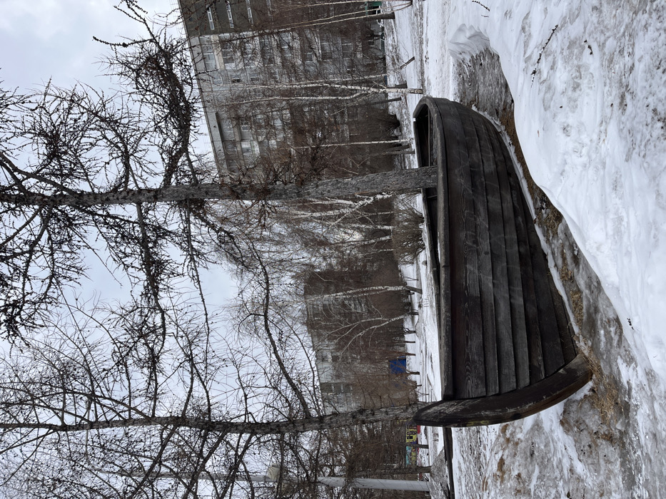 This image displays a winter scene within a residential courtyard near Mira Avenue 105 in Krasnoyarsk, Russia. The central object is a stationary, dark, weathered wooden boat-shaped structure, partially submerged in a mixture of snow, ice, and exposed brown earth. A slender, leafless deciduous tree with dark bark grows vertically from the interior of the boat. The surrounding ground is uneven, covered by patchy, dirty snow and areas of brown soil and sparse yellowed grass. Numerous other bare deciduous trees, some with light-colored bark typical of birches, are densely distributed across the midground, their intricate branch networks silhouetted against an overcast grey sky. In the background, multiple multi-story residential apartment buildings with visible windows and balconies, consistent with Soviet-era architectural styles, rise above the tree line. Faint, colorful elements suggestive of additional playground equipment are discernible in the far left background. No human or animal subjects are present.