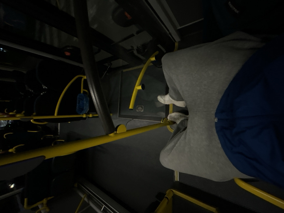 Inside a bus with yellow handrails, a person is seated. They wear a gray tracksuit with a blue portion. Their feet, clad in white sneakers and socks, are visible resting on a lower handrail. Seats are visible on the left. The bus interior is dark with limited light, focusing on the seated individual and the immediate surroundings.