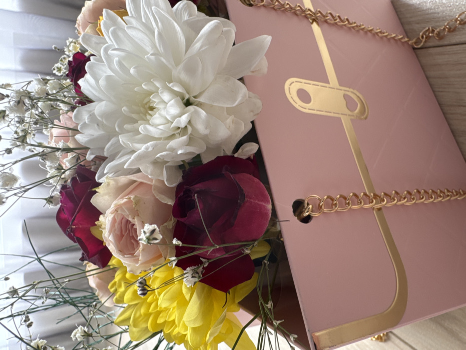 - "The image displays a close-up, elevated view of a floral arrangement presented within a light pink, rectangular box-like container, located indoors within the city of Varna, Bulgaria" by FM-Je3Xv1, licensed under CC BY 4.0
