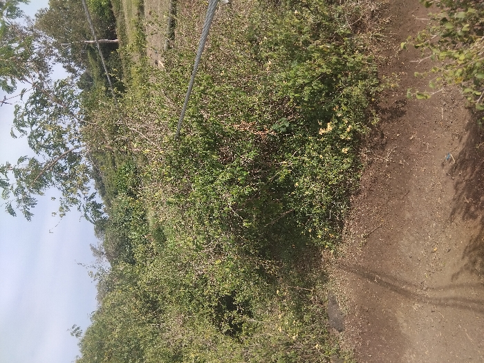 A landscape scene depicts a narrow dirt path bordered by dense, green vegetation and trees. Overhead, two metallic cables stretch across the frame. The foliage appears overgrown and wild, contrasting with the bare path. The sky is a pale blue, suggesting daylight. Shadows play on the path, hinting at a sunlit environment, though the overall lighting seems soft.