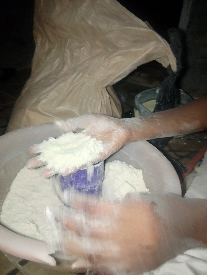 - "A pair of hands are submerged in a large bowl filled with a white, powdery substance, possibly flour" by FM-TfCf73, licensed under CC BY 4.0