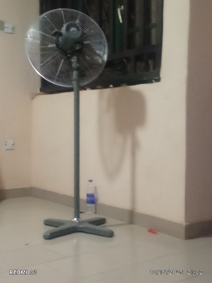 The scene is located in an indoor room within the city of Unknown, Unknown. A gray-green standing pedestal fan is centrally positioned on a light-colored tiled floor, featuring a circular grille, a central motor housing, a vertical pole, and a four-legged cross-shaped base. To the immediate right of the fan's pole, a clear plastic water bottle with a blue label and cap stands on the floor. The walls are painted a uniform light beige or cream color, with a dark gray baseboard running along the bottom. In the upper background, a dark-framed window with horizontal and vertical security bars is visible. An off-white electrical outlet is mounted on the left wall. A distinct shadow of the fan, including its head and pole, is cast on the back wall to the right of the actual fan, indicating a light source from the left. A small, irregularly shaped red object lies on the tiled floor near the intersection of the back and right walls. No people are present, and no active interactions or actions are depicted. Visible text in the lower left corner reads "REDMI A8," and in the lower right corner, "10/16/2025 21:02."