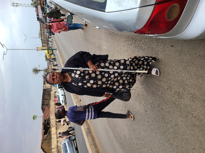 The image presents an urban street scene under an overcast sky in the city of Unknown, Unknown. In the foreground, a middle-aged woman with dark skin and braided hair, wearing a black long-sleeved top over a black dress with a white and brown floral pattern and white sandals, walks on asphalt pavement. She holds a white cane with a silver shaft in her left hand, which also carries a dark bag. Her gaze is directed forward. To her immediate left, a young male with dark skin, wearing a blue patterned shirt, dark pants with a red side stripe, and light sandals, stands facing away from the camera, looking towards the left side of the frame. The rear section of a silver sedan is parked directly to the woman's right. The street features a concrete median barrier. On the left side of the road, multiple vehicles are parked, including a silver hatchback, with several pedestrians gathered near old, single-story buildings exhibiting faded walls and corrugated metal roofs, one of which appears partially damaged. A loose tire is visible near a group of individuals on the roadside. Further down the road, a yellow tanker truck is discernible. Modern streetlights with multiple LED panels are present along the thoroughfare. In the midground, to the right of the main subject, another woman wearing a reddish-pink shirt and blue jeans walks in the same direction. Scattered trees, including palm trees, are visible in the background.