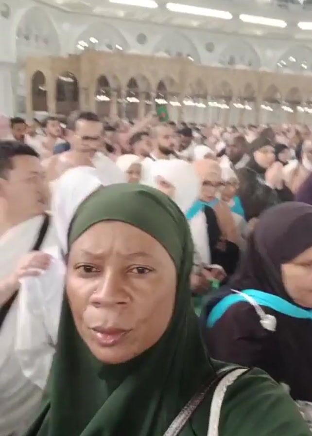 woman wearing a dark green hijab taking a selfie in a very crowded indoor area. The space appears to be a mosque, judging by the large number of people in traditional Muslim attire, including men in white robes and women wearing hijabs. Many people surround her, most wearing white. The architecture includes ornate columns and arches. The lighting is bright. The crowd is dense, and the woman appears to be moving along with the flow of the crowd. The mood appears solemn.
