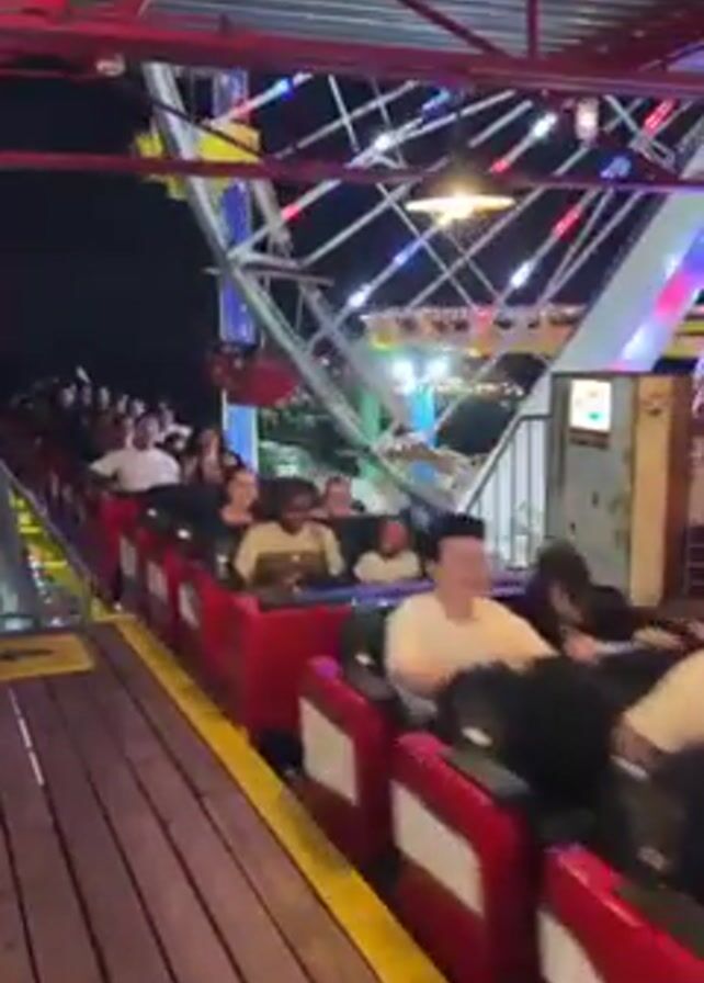 rollercoaster at an amusement park at night. The rollercoaster is in the form of red cars. The cars are full of people. The rollercoaster is traveling along a yellow track. In the background, there is a Ferris wheel with colored lights. There is a person in an orange shirt standing near the start of the ride.